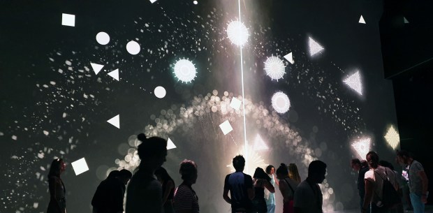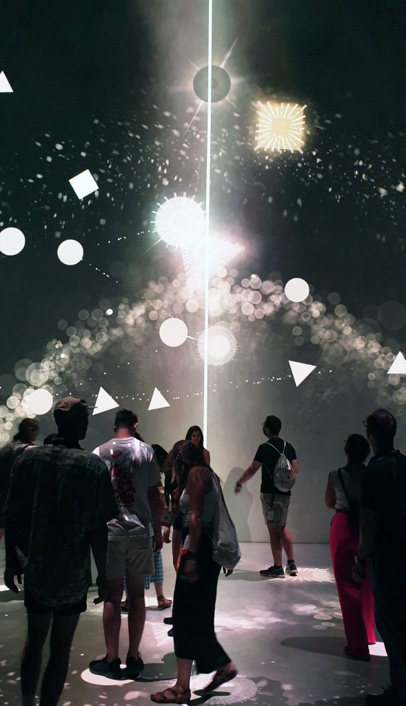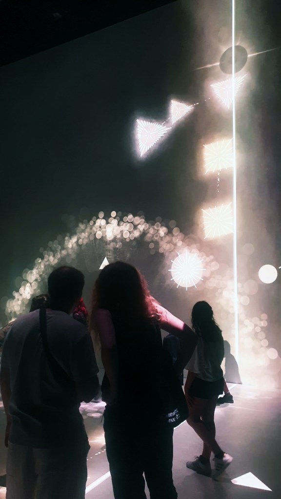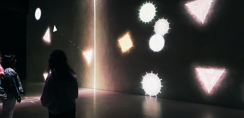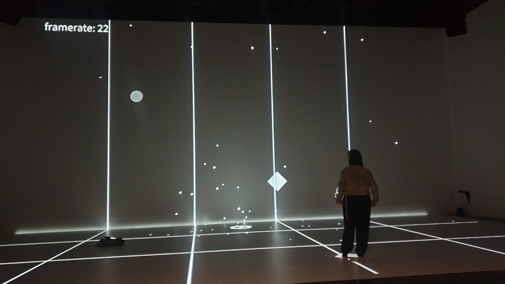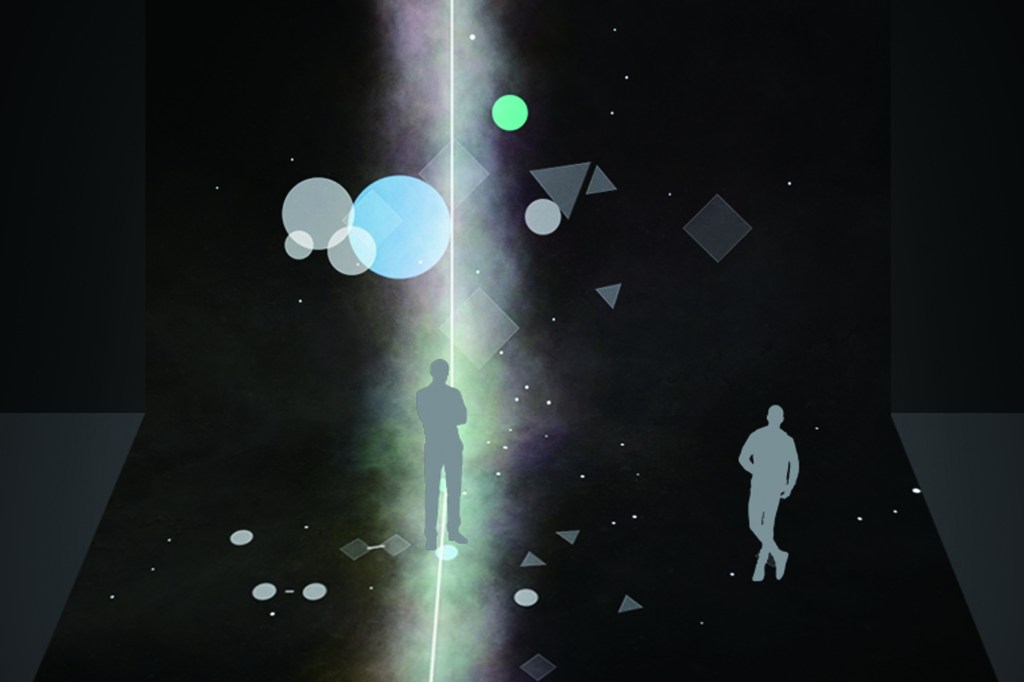 “Voyage” expands on my earlier project, Sound of Kandinsky, and uses laser tracking to create a participatory, audiovisual experience. In this work, each participant becomes a geometric shape—a triangle, circle, or square—which, when placed on the stage, triggers distinct sounds based on their position. A central user, referred to as the conductor, activates a series of sound waves as they move past the other shapes. When shapes are near each other, lines form between them, resembling constellations and leading to the creation of new stars.