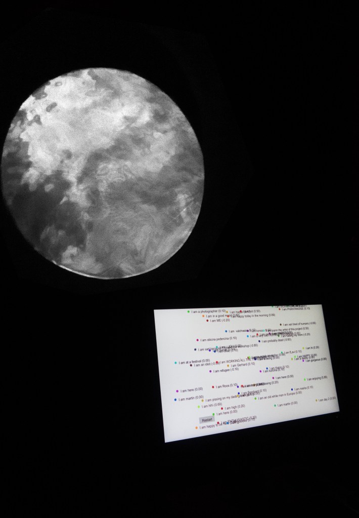 “I am, We are” invites participants to reflect on their identity by answering a prompt starting with “I am…” on an interactive interface. The AI analyzes the user’s response for emotional content, assigning it a sentiment score (-1.0 to 1.0, from negative to positive). This score affects the saturation and brightness of the color selected by the user, creating a unique visual representation of their emotional state.
